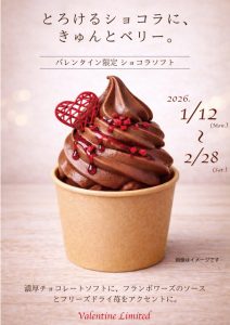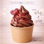 ミルキーで濃厚な自家製チョコレートソフトに、フランボワーズソースとフリーズドライいちごをアクセントで散らし、ハート型の網チョコを添えました。