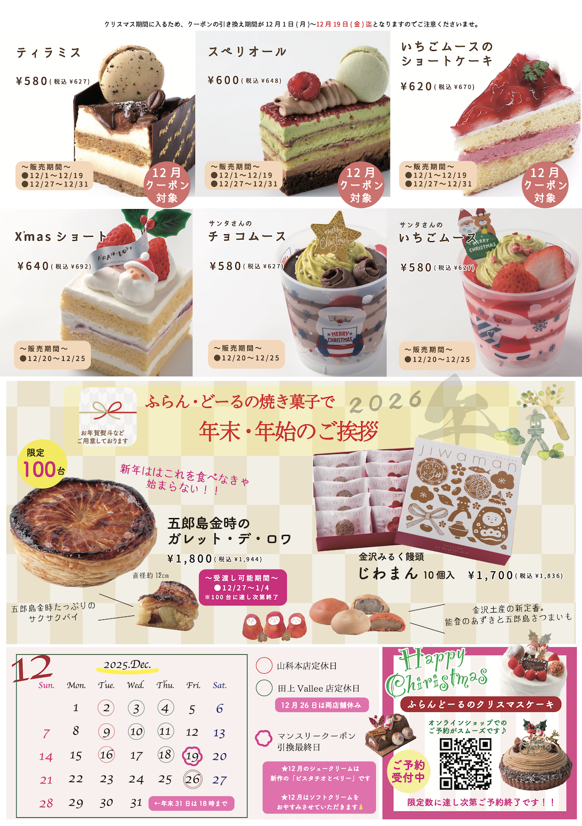 ●12月のマンスリーケーキの引き換え期限は19日(金)まで