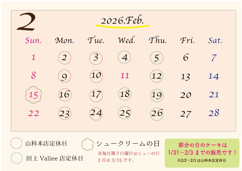 ※赤文字、赤背景の日は定休日となります。